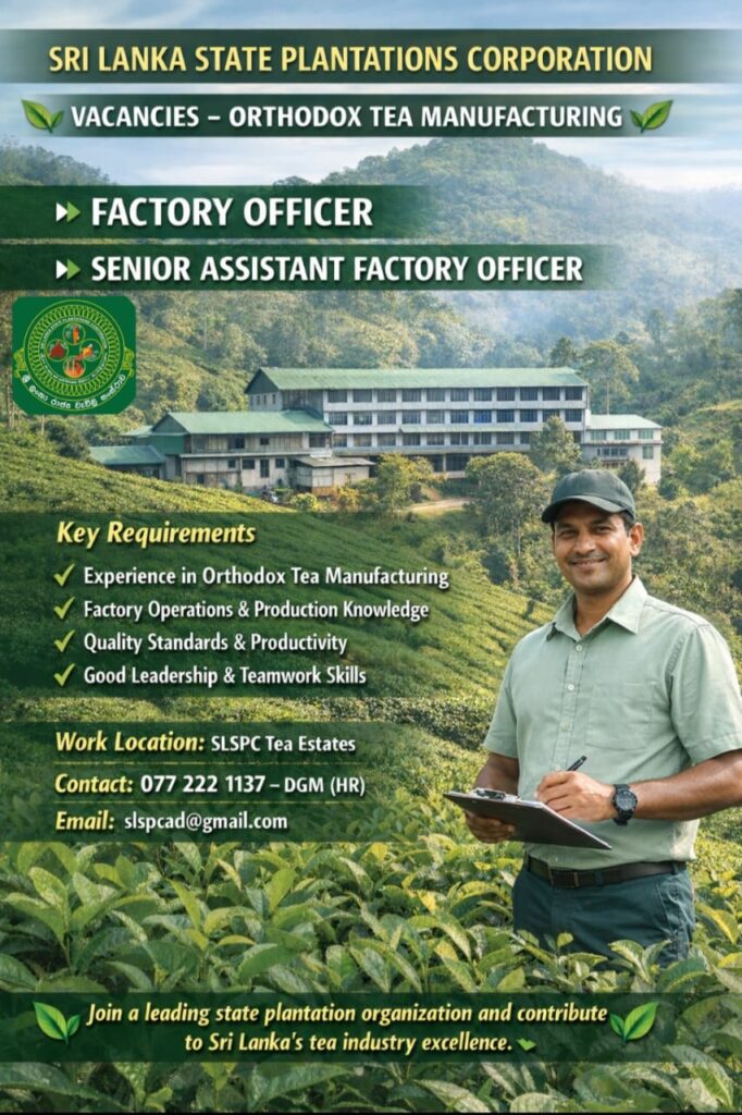 Are you an expert in the tea industry looking to elevate your career? The Sri Lanka State Plantations Corporation (SLSPC) is currently seeking dedicated and experienced professionals to join our team in the Orthodox Tea Manufacturing sector.